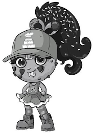 The mark consists of a smiling girl with cookie as her face standing with her arms by the waist, in striped stockings and boots, wearing a cap with an image of a cake located in the center of the cap with her hair tied and sprinkled with sprinkles and wearing a dress with frills around the edges of the dress as well as an image of cookie located in the chest area.