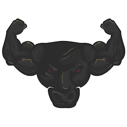 The mark consists of an image of a black bulls head and horns, with the horns shown as two muscular arms. The eyes are red and the accents are gray and yellow.