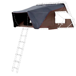 The mark consists of a three-dimensional configuration of a camping tent in an overall trapezoidal shape; the main portion of the tent in brown has an oblique or triangular shape with a grey awning, with red edging, positioned diagonally above the main part of the tent; the windows, window awnings, ladder, hard top/case, and roping are not claimed as a feature of the mark and shown in broken or dotted lines.