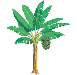 The mark consists of a fanciful rendering of a plantain tree, the leaves of light green with dark green shading and yellow spines of which radiate from a brown, yellow and tan tree trunk, with a bunch of plantains in light green with black shading displayed in front of the lowermost right.