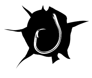 The mark consists of a stylized fish hook design inside a shaded free form field in the shape of a bullet hole design.