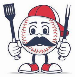 The mark consists of a character design formed from a stylized baseball with human facial features, hands and legs. The character appears in white, black, red and gray, and is outlined in black. The character also has a black mustache, and is holding a black and white spatula in its right hand, with a black and white cooking fork appearing in its left hand. The character is also wearing a baseball cap of red, white and black, and sneakers of red, white and black. A gray shadow also appears beneath the character.