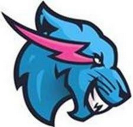 The mark consists of the design of a side profile of a growling animal's head, facing right. The head is shaded blue and light blue with black outlining, a black nose, and black whiskers. The animal's sclera and teeth are shaded white. Imposed on top of the head is a design of a lightning bolt shaded in pink and light pink with black outlining.