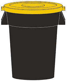 The mark consists of the color construction yellow as applied to the lid, and the color black as applied to the body, of trash cans and buckets. The construction yellow color is defined as Pantone Yellow 7406c or · L*,a*,b* = L - 77.03, a - 2.91, b - 70.24 with a Delta e of 3. The material depicted in broken lines is not claimed as a feature of the mark, but serves to show the position of the mark on the goods.