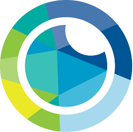 The mark consists of an annular ring partitioned into shades of grey-blue, dark-blue, light-blue, green, yellow-green, light green and blue-green, with a concentric circle within the annular ring that has a semi-circular portion missing on the top-right of the circle. The circle has a coloring effect created by irregularly shaped triangles and polygons being drawn across the circle interior which are colored grey-blue, dark-blue, light-blue, blue-green, green, and blue. The white interior between the annular ring and the concentric circle as well as the white appearing outside of the annular right represents background and are not part of the mark.