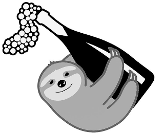 The mark consists of a sloth having four limbs holding a champagne bottle, the combined sloth and champagne being inclined at an angle, and the champagne bottle having bubbles fizzling from the mouth of the bottle.