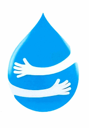 The mark consists of two stretched hands in white embracing a stylized tear-shaped design in blue with white highlights.