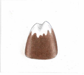 The mark consists of the illustrated shape and configuration of three-dimensional chocolate candy in brown having a distinctive curved shape with two white peaks at the top to mimic those of a mountain top