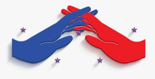 The mark consists of one blue hand and one red hand, both with black and white outlining and gray shadowing towards the lower left with fingers entwined and a purple star above each wrist, one purple star below the intertwined fingers and two purple stars all with gray shadowing towards the lower left.