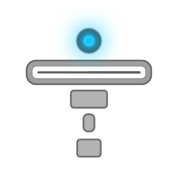 The mark consists generally of five elements, centered and stacked on top of each other with little but some space between them; the elements consisting of four rounded cornered rectangles of different sizes, and a circle on the top that gives a glowing effect. The overall effect of the mark is intended to look like a human being with arms held wide-out. The circle at the top contains a light blue center that fades out into a dark gray outer rim/border, and has a light blue glowing emitting effect beginning from the outer circle rim fading into the background. Beneath the circle is the largest rectangle positioned horizontally, with a dark gray line cutting horizontally through the hollow middle, double lined in dark gray and light gray. Beneath the largest rectangle are the three smaller rectangles, each with a dark gray boarder and light gray fill - in order: the second largest rectangle positioned horizontally, the smallest rectangle positioned vertically, and finally the last rectangle positioned horizontally. The color white in the mark represents background and/or transparent areas and is not part of the mark.