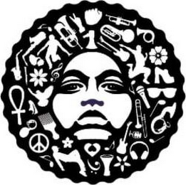 The mark consists of the design of the bust of a face facing forward that has hair that surrounds the face in the form of a circle having a scalloped outer edge. Inside the hair appears the depiction of several different musical instruments, various musical notes and symbols, numerous flowers, people dancing, a comb, sunglasses, shoes, a bird with outstretched wings, a peace symbol, a stylized heart and several hand symbols