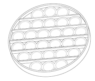 The mark consists of the configuration of a three-dimensional manipulative bubble popping game containing the following elements: 1. The game is in the shape of a circle with a circumference having an embossed ridge. 2. Five embossed ridges transverse the circle creating six equally high rows. 3. Each row contains semi-spherical contiguous "bumps" (bubbles), each surrounded by a circular embossed ridge, as follows: Row 1: three bubbles Row 2: five bubbles Row 3: six bubbles Row 4: six bubbles Row 5: five bubbles Row 6: three bubbles. The broken lines depicting the manipulative bubbles indicate placement of the manipulative bubbles on the goods and are not part of the mark.