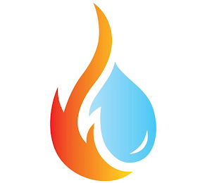 The mark consists of a stylized liquid drop shape where the left side consists of an orange flame and the right side consists of a smaller blue liquid drop shape. The color white represents background, outlining, shading, and/or transparent area and is not part of the mark.