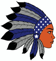 The mark consists of an illustration of a woman's head, the woman's skin color is copper, her eyes are copper and black, she has black eyebrows, black eyelashes and her features are outlined in the color black. The woman is wearing a Native American headdress consisting of nine feathers appearing in the colors blue and grey outlined in black with black tips and with a blue head band base with 16 white stars.