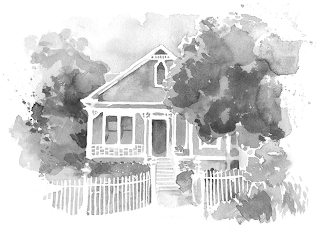 The mark consists of a watercolor painting of a gable roof cottage nestled among trees with steps leading up to the front door. The upper right side of the house is obscured by the leaves of a large tree. A low thin picket fence in the foreground opens in the center to a walkway leading to the front steps.