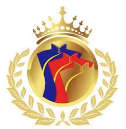 The mark consists of a gold and white crown on the top, with a golden plate under the golden crown, and a pair of gold and white leaves forming a semi-circle around the golden plate from the bottom upward. In the golden plate, there is a design of three collared shirts: a gold collared shirt stacked on a red collared shirt, and the red collared shirt on a blue collared shirt. The color white represents background, outlining, shading, and/or transparent area and is not part of the mark.