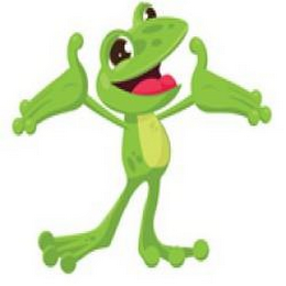 The mark consists of a drawing of an anthropomorphic green frog, with a face featuring black irises on white eyeballs and a red tongue in a smiling mouth, standing on two three-toed feet, holding two three-fingered hands out in a welcoming gesture.
