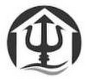 The mark consists of a shaded circle containing a stylized house containing a stylized trident with two wavy horizontal lines below it with the top line touching the bottom of the trident.