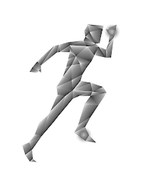 The mark consists of a figure of a man running: the man's leading hand and leading knee are raised and to the right, his trailing hand and trailing leg are oriented downward and to the left, the figure has diffuse circle perimeters superimposed upon the leading hand and leading foot, the figure has component polygons, wherein some edges and vertices are lighter and some edges are vertices are darker, and shading transitions to both the lighter and darker areas are by smooth gradients.