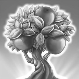 The mark consists of a leafy tree that has a twisted trunk, two branches, three large apples, and an outline of glowing light against a gradient background.