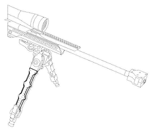 The mark consists of a three-dimensional configuration of a scalloped faceplate affixed to the exterior surface of a bipod leg. The dashed outline surrounding the screws on the faceplate, the other parts of the bipod, and the firearm serve to show the positioning of the mark and are not claimed as part of the mark.