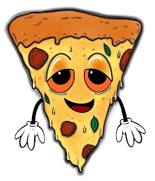 The mark consists of a yellow stylized slice of pizza character with a brown crust that resembles a person, which is outlined in black. The pizza features maroon slices of pepperoni and green basil leaves amid tiny orange spots throughout the cheese. There is a slightly smiling face in the middle of the pizza comprised of black and red eyes and a black mouth with a red tongue. The pizza slice has two black arms and two white gloved hands at its sides.