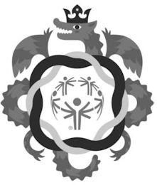 The mark consists of five stylized stick figures, positioned as if flying around a small globe, encircled by two intertwined loops, one darker than the other, and all surrounded by a mythical dragon creature wearing a crown.