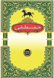 The mark consists of a label with the center background appearing in yellow and white with a black circle with black leaf design partially around it, and wording that transliterates to "MOHAMMAD AL-YAHIYA" in white. Above this design is a red oval with a brown border outlined in black. In the center of the red oval is the wording which transliterates to "MUSTAFA" in white outlined in black and wording which transliterates to "ARUZZ" in gold above it. Above this design is a black horse with yellow and brown mane. Surrounding all of these elements is an outer border design that is identical on top and bottom, separated by columns on each side. The top half of this border has a brown border followed by a green and white patterned design that wraps around the entire top half of the design. Moving inward, a brown border followed by a yellow flower and brown leaf design on a green background. The bottom half has the same designs. Two columns appear on each side with gold bases and middles, green center columns with gold lines in the middle.