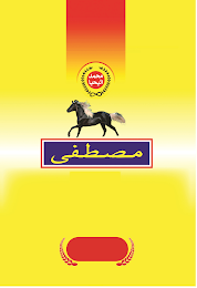 The mark consists of a label appearing in yellow with the middle portion a faded white. At the top center is a red strip moving down and fading out over a red circle with the white lettering that transliterates to "MOHAMMAD AL-YAHIYA". Surrounding this red circle is a black leaf design with a partially red circled line above it. Below is a black horse with brown mane. Below the horse is a purple box with yellow lettering which transliterates to "MUSTAFA". The box is outlined in white and then red. At the bottom center is a red oval shape with red leaf design on each side.