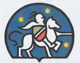 The mark consists of a semicircle that features a pointed ending, outlined in black and with a blue background. The shape features three six-point stars in yellow, surrounding a design comprised of a knight on horse, outlined in black and filled in white. The knight carries a shield outlined in black that features a white division and a green and red side, and white spear that is outlined in black.
