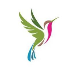 The mark consists of a hummingbird in flight with a green beak, taupe head, pink and taupe body, green wings, and blue tail feathers. The white background is not claimed as a feature of the mark.