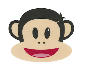 The mark consists of a wide mouth smiling monkey with a beige face, beige and black ears, black hair, black eyes with white pupils, a black nose, and a red mouth with a pink tongue.