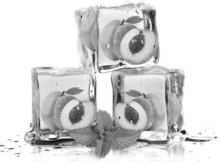The mark consists of three ice cubes each with a peach with a stem and a leaf and a peach half frozen in the center with one cube stacked on top of the other two, with a mint sprig center between the two bottom ice cubes with water droplets around the base of the ice cubes.