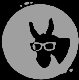 The mark consists of the silhouette of a donkey head wearing glasses encompassed within a shaded circle with tiny shaded circles directly outside of the shaded circle. The black background represents background and/or transparent areas and is not a feature of the mark.