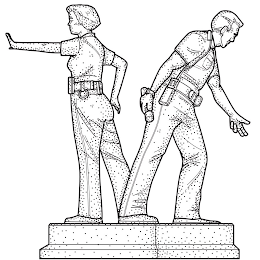 The mark consists of design of a statue featuring two police officers. The police officer on the left is a woman facing left and extending her left hand at shoulder level. The police officer on the right is a man facing right and leaning with left hand extended.