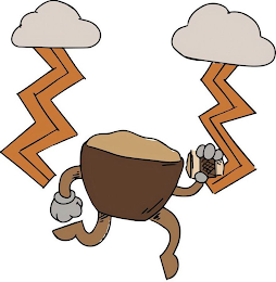The mark consists of a dark brown coffee mug, with lighter brown arms and legs, running in between two grey clouds that have burnt orange lightning bolts coming out of them. The lightning bolts have a black line going down the middle. The mug has tan coffee in it. The mug has grey gloves on, and is holding a tan cup of coffee with a dark brown coffee sleeve. Everything is outlined in black. The white background represents transparent area and is not part of the mark.