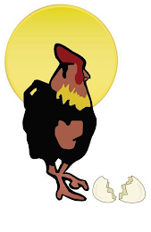 The mark consists of the following: a stylized depiction of a chicken rendered in red, brown, yellow, and black, against a stylized depiction of the sun in yellow bordered in olive green, with a stylized depiction of a broken egg in white with gray shading and olive green outline and interior, all to the bottom right of the mark.
