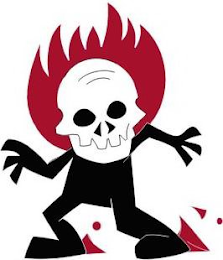 The mark consists of white skull in front of red flames on a black body with red flames near each of the feet. The eyes, nose, mouth, and forehead lines on the skull are black.
