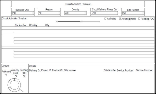 The mark consists of a graph at the top of which appear the wording CIRCUIT ACTIVATION FORECAST, below which appear boxes entitled "BUSINESS UNIT" "REGION" "COUNTRY" "CIRCUIT DELIVERY PHASE QTR" "SITE NUMBER" with drop down menus, below which appears a box entitled CIRCUIT ACTIVATION TIMELINE with three boxed to the right entitled "ACTIVATED" "AWAITING INSTALL" "PENDING FOC", below which appears "SITE NUMBER" "COUNTRY" "CITY", below and to the right appears a box called CIRCUITS with the following entries "ACTIVATED" "AWAITING INSTALL" "PENDING FOC" and a circle design to the right of which appears a box called DETAILS listing the following categories: "DELIVERY GR PROJECT ID PROVIDER OR SITE NAMEO" "SITE" "NUMBER" "SERVICE PROVIDER" and "SERVICE PROVIDER".
