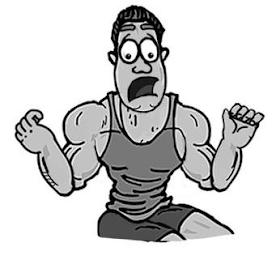The mark consists of a drawing of a muscular man in a tank top and shorts with a fearful face in a generally sitting position.