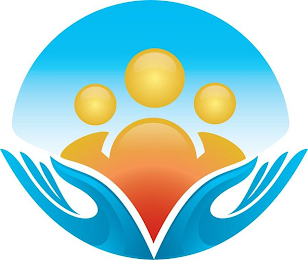 The mark consists of an overall circular design comprising an abstract design of three people in shades of yellow, orange, and red partially formed by three circles in shades of yellow atop a shaded semicircle in shades of blue resembling the sky, positioned above two open hands in shades of blue.