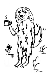 The mark consists of a sketch of a shaggy dog standing on its hind legs and holding a steaming cup with its right front paw, with a flower and two tufts of grass on the ground.