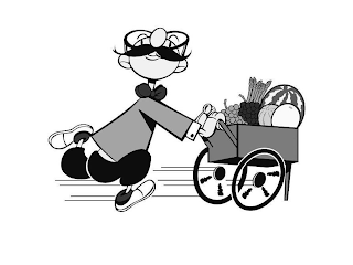 The mark consists of stylized drawing of a man with a mustache wearing glasses, a bow tie, shirt, pants and shoes, pushing a two-wheeled cart filled with fruits and vegetables.