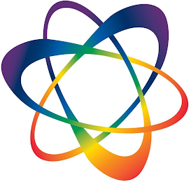 The mark consists of three ellipses oriented in each of three dimensions around a common center with each ellipse having a broad end and a narrow end and with each ellipse being colored to transition from red to orange to yellow to green to blue to indigo to violet.
