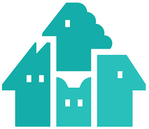 The mark consists of a design component consisting of a profile image of a woman, a man, a cat, and a dog, all in aqua blue, forming the shape of a house. The color white represents background, outlining, shading and/or transparent areas and is not part of the mark.