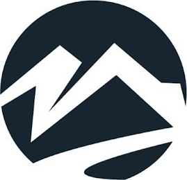 The mark consists of a circle containing two overlapping, shadowed mountain peaks with a curving river at the base.