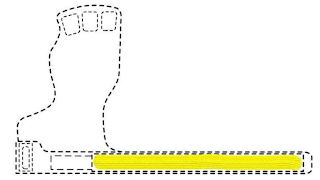 The mark consists of the color yellow applied to the fastening strap of protective hand grips used with gymnastics, exercise training, and functional fitness. The matter represented by dotted lines is not part of the mark and serves only to show the position of the mark.