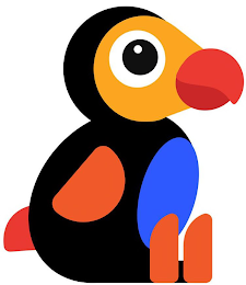 The mark consists of the profile of a sitting bird with a red and dark red beak, a yellow face, a black and white eye, a black body, a blue chest, an orange wing, a red tail, and orange feet.