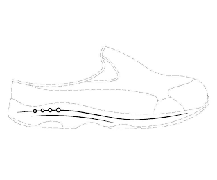 The mark consists of four circles in ascending size appearing on the side of a midsole of a shoe; the circles appear in the center of the back portion of the midsole with a wavy line starting near the heel of the shoe connecting the four circles and then running the length of the midsole to almost the toe of the shoe, another curved line appears below the first and runs along the back portion of the midsole over the arch to the beginning of the front portion of the midsole; the matter shown by the broken lines is not a part of the mark and serves only to show the position of the mark.