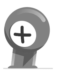 The mark consists of A shaded circle and a smaller circle in its center offset slightly to the bottom left with a "+'" symbol in the center, atop a shaded vertical pedestal which is slightly slanted to the right, all above a thin horizontal line.